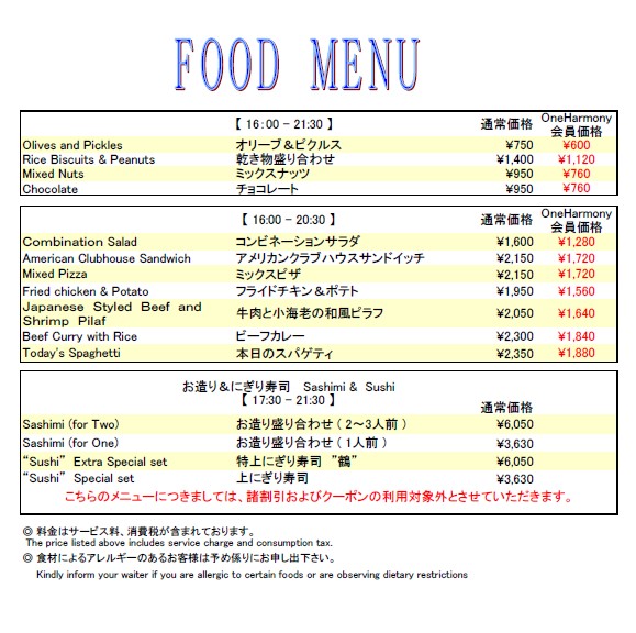 FOOD MENU 18:00~24:00(L.Oフード22:30/ドリンク23:45)